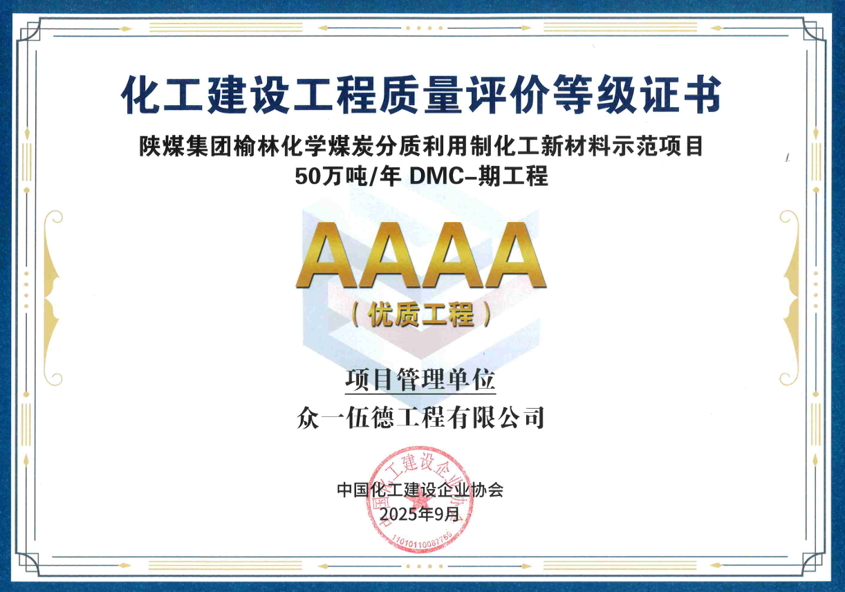 近日,陕煤集团榆林化学宇高新材料有限责任公司50万吨/年DMC项目一期工程,凭借其卓越的建设质量、领先的技术应用与全过程精细化管理,成功获评“化工建设工程质量AAAA优质工程”。化工建设工程质量评价是全国化工建设行业工程...